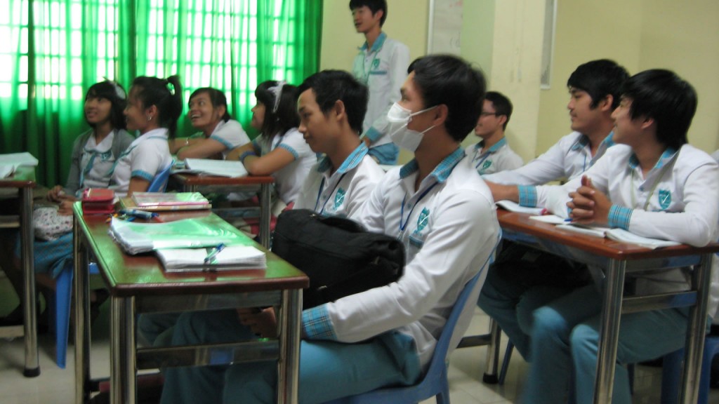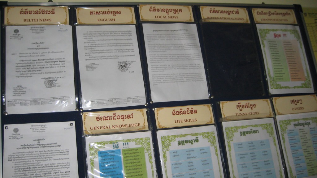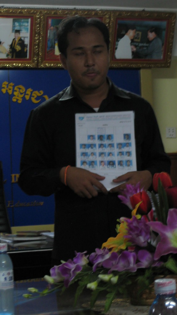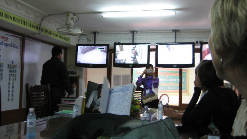 In addition to visiting an empty classroom, we were introduced to students in an English language class and to students in a class taught in Khmer. The teachers’ room includes video monitors so that administrators can watch faculty and their students throughout the day. Administrators have access to seating charts so that they can take note of anyone who is out of order.